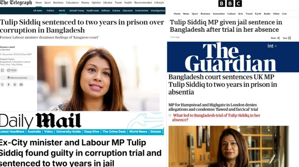 ব্রিটিশ সংবাদমাধ্যম বিবিসি বলছে—‘বিনা উপস্থিতিতে বিচার শেষে বাংলাদেশে টিউলিপ সিদ্দিক এমপিকে কারাদণ্ড’। ফিনান্সিয়াল টাইমস শিরোনাম করেছে ‘সাবেক ব্রিটিশ মন্ত্রী টিউলিপ সিদ্দিকের বাংলাদেশে দুই বছরের কারাদণ্ড’।