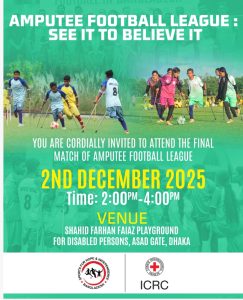 আন্তর্জাতিক প্রতিবন্ধী দিবস উদযাপনের অংশ হিসেবে ১-২ ডিসেম্বর (সোমবার ও মঙ্গলবার) দুইদিন ব্যাপী অনুষ্ঠিত হবে অ্যাম্পিউটি ফুটবল লিগ ২০২৫।