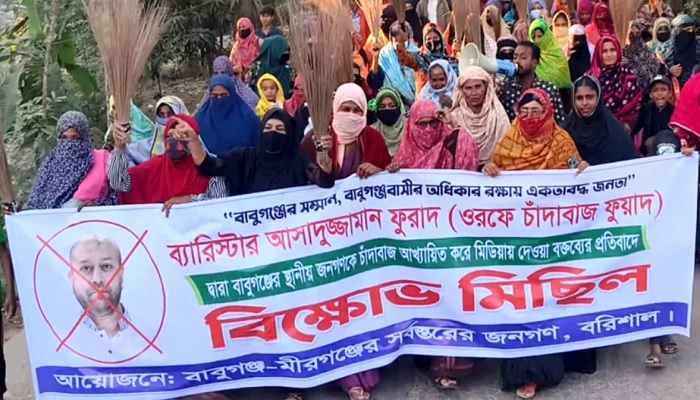 বরিশালের বাবুগঞ্জে স্থানীয় জনগণের ওপর ‘চাঁদাবাজ’ মন্তব্য করার প্রতিবাদে আমার বাংলাদেশ (এবি) পার্টির সাধারণ সম্পাদক আসাদুজ্জামান ফুয়াদের বিরুদ্ধে ঝাড়ু হাতে বিক্ষোভ মিছিল অনুষ্ঠিত হয়েছে। গতকাল বুধবার বিকেলে ‘বাবুগঞ্জ-মীরগঞ্জের সর্বস্তরের জনগণ’ ব্যানারে এ কর্মসূচি হয়।