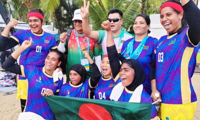 চীনের সানিয়ায় এশিয়ান বিচ গেমস নারী কাবাডির ফাইনালে ওঠার লড়াইয়ে ভারতের শক্তিশালী দেয়াল টপকাতে পারেনি বাংলাদেশ। সেমিফাইনালের হাই-ভোল্টেজ ম্যাচে ভারতের কাছে ৫০-৩১ পয়েন্টে পরাজিত হয়েছে লাল-সবুজের প্রতিনিধিরা। তবে ফাইনালে পৌঁছাতে না পারলেও খালি হাতে ফিরছে না বাংলাদেশ; সেমিফাইনালে খেলায় নিয়ম অনুযায়ী নিশ্চিত হয়েছে বাংলাদেশের ব্রোঞ্জ পদক। টুর্নামেন্টের শুরু থেকেই দুর্দান্ত খেলা বাংলাদেশের নারী দলটি র্যাংকিংয়ে তৃতীয় স্থান নিয়ে আসর শেষ করল।