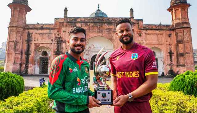 শুক্রবার (১৭ অক্টোবর) সাপ্তাহিক ছুটির দিনে পুরান ঢাকার কর্মব্যস্ততা তখনও সেভাবে শুরু হয়নি। তবে লালবাগ কেল্লায় সকাল থেকেই দেখা গেল ক্রিকেটীয় কর্মযজ্ঞ। ট্রফি নিয়ে ঐতিহাসিক স্থাপনার ভেতরে দাঁড়িয়ে গেলেন মেহেদী হাসান মিরাজ ও শাই হোপ।