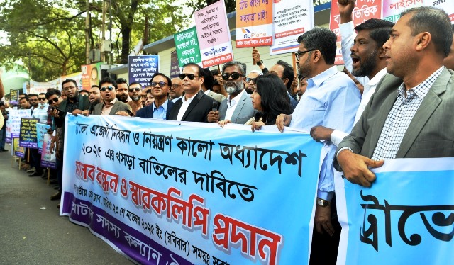 বাংলাদেশ ট্রাভেল এজেন্সি (নিবন্ধন ও নিয়ন্ত্রণ) আইন সংশোধনের প্রস্তাবিত নতুন খসড়া অধ্যাদেশ-২০২৫ বাতিলের দাবি জানিয়ে জাতীয় প্রেসক্লাবের সামনে বিক্ষোভ সমাবেশ করছেন এ খাতের ব্যবসায়ীরা।